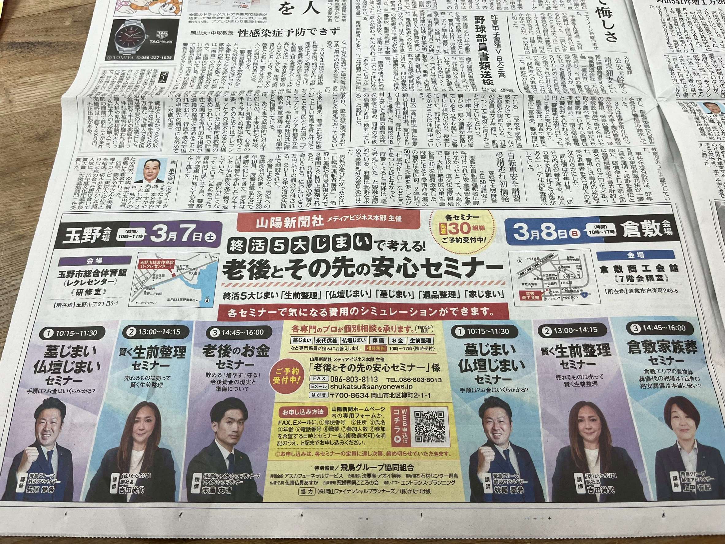 3月7日(土)・8日(日)山陽新聞社主催・飛鳥グループ特別協賛「終活セミナー」を開催します。